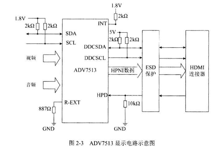 问题:2.4   李工设计的ADV7513显示电路示意图如图2-3所示。