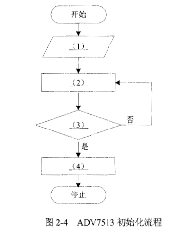 按照此初始化过程,李工设计了如图2-4所示的ADV7513初始化流程。请根据处理逻辑,从以下选项A~I中选择正确答案,填写空(1)~(4)。