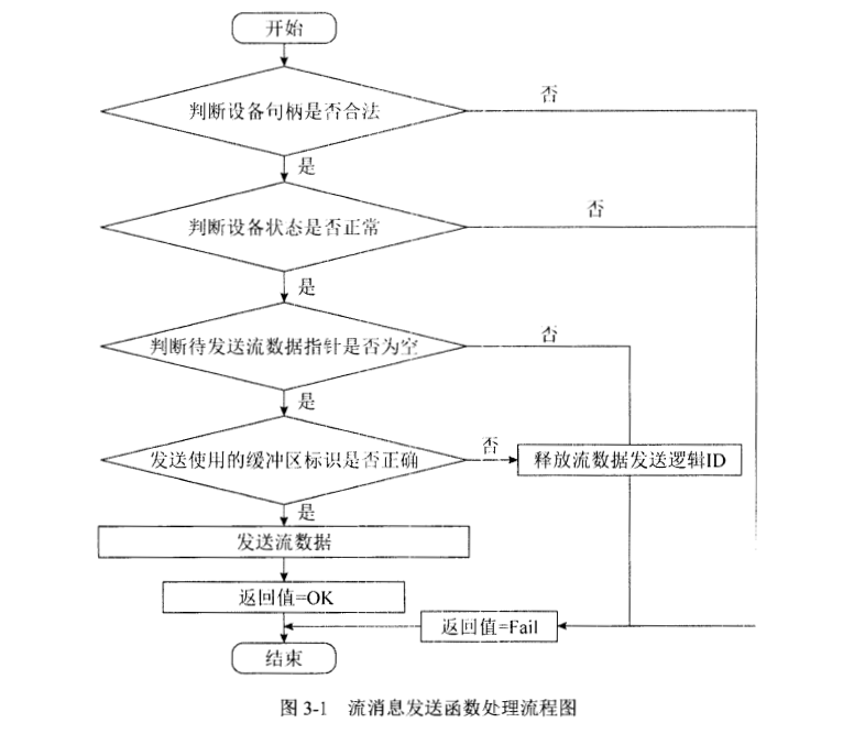 某国产通信芯片中,其嵌入式软件配合硬件完成通信协议处理,包括设备管理、通信管理、时间管理、网络管理、配置加载和中断处理等功能。其中流消息发送函数用于流消息发送,主要完成分区包头封装,并向指定目的设备的指定目的分区发送流消息,其处理流程图如图3-1所示。