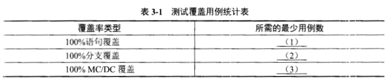 请指出测试上述算法达到100%语句覆盖、100%分支覆盖和100%MC/DC覆盖所需的最少测试用例数目,填入表3-1的空(1)~(3)处。