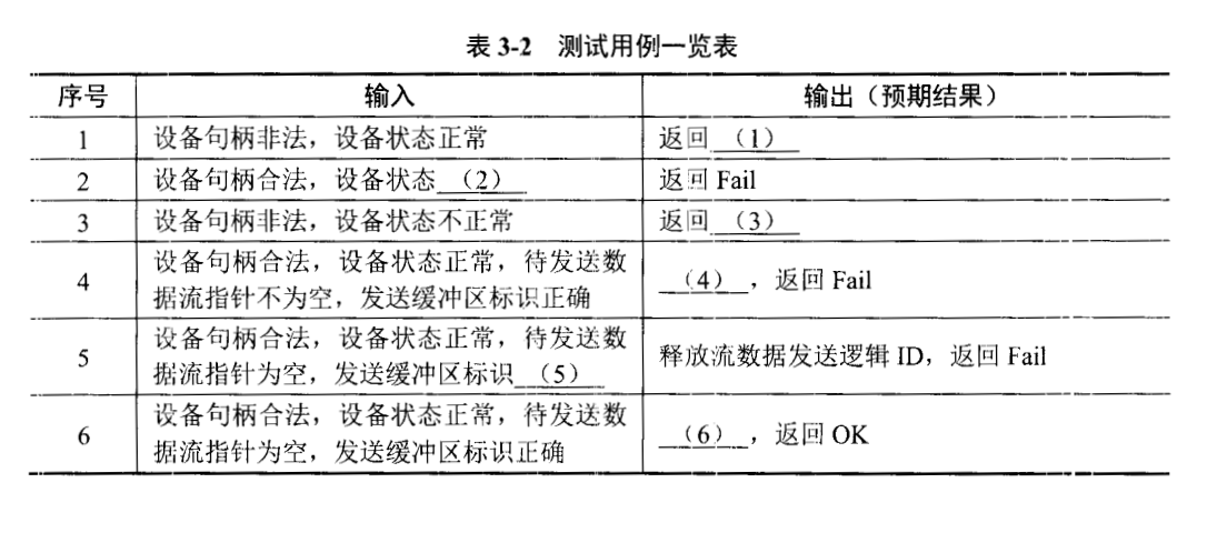 问题:3.2   为了测试软件功能,测试人员设计了表3-2所示的测试用例,请填写该表中的空白(1)~(6)。请将答案填写在答题纸的对应栏中。
