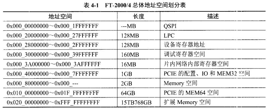 问题:4.3   FT-2000/4的物理地址宽度为44bit,地址空间共计16TB。FT-2000/4总体地址空间划分见表 4-1。