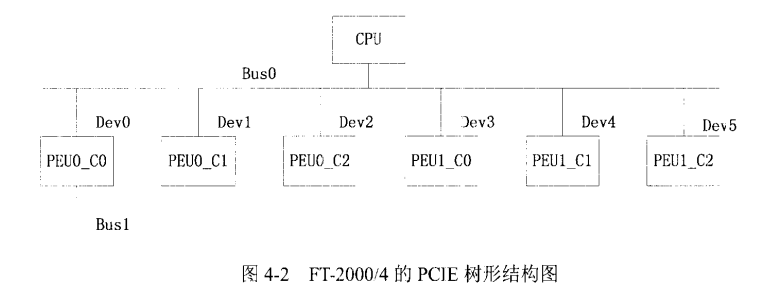 问题:4.4   FT-2000/4PCIE接口支持PCIE3.0规范,FT-2000/4的PCIE是树形结构,所有控制器都是0号总线下的设备,如图4-2所示。当访问的总线号为0时,表示是对控制器的访问。当总线号对应的控制器确实存在时,那么就转发为对控制器内配置寄存器的访问;不存在时,忽略写请求,读请求返回全F。PCIE 树形结构视图如图4-2所示。