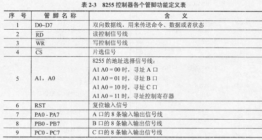 8255控制器各个管脚及地址控制描述如表2-3所示。