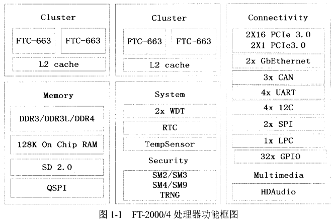 FT-2000/4是一款兼容ARMv8体系结构,支持64位和32位指令的高性能国产通用处理器,主频2.6~3.0GHz,工作温度范围是-40℃~85℃,内置密码加速引擎,集成系统级安全机制,能够满足复杂应用场景下的性能需求和安全可信需求。FT-2000/4处理器功能枉图如图 1-1所示。