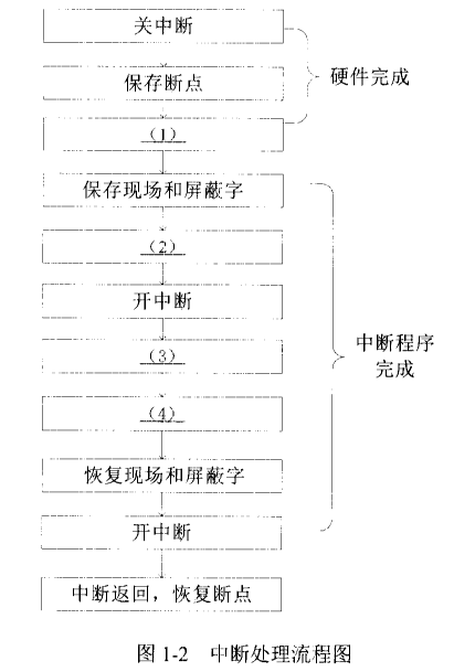 在IO处理时,采用中断方式处理输入输出。中断处理过程包括关中断、保存断点、识别中断源等一系列步骤,如图 1-2 所示,请填写其中的空(1)~(4),将答案写在答题纸的对应栏中。