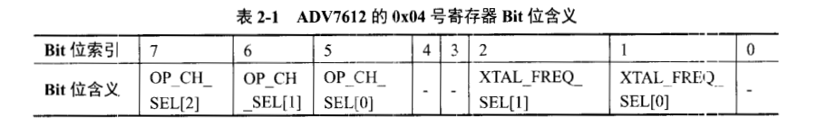 (2)根据HDMI视频采集芯片手册描述,ADV7612可支持四种频率晶振输入,分别是27.000MHz、28.63636MHz、24.576MHz、24.000MHz。在具体使用时需要根据设计来配置ADV7612的0x04号寄存器。ADV7612的0x04号寄存器各个Bit位的含义如表2-1所示。