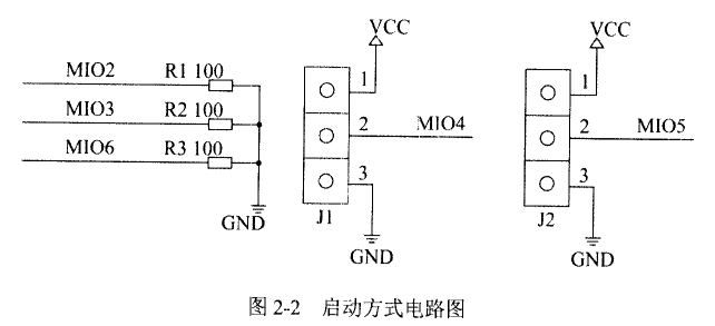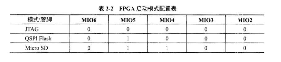 在该系统中,FPGA支持三种启动方式,分别是JTAG、QSPIFlash和Micro SD,需要利用FPGA的五个管脚MIO[6:2]来配置,对应的配置模式如表2-2所示。