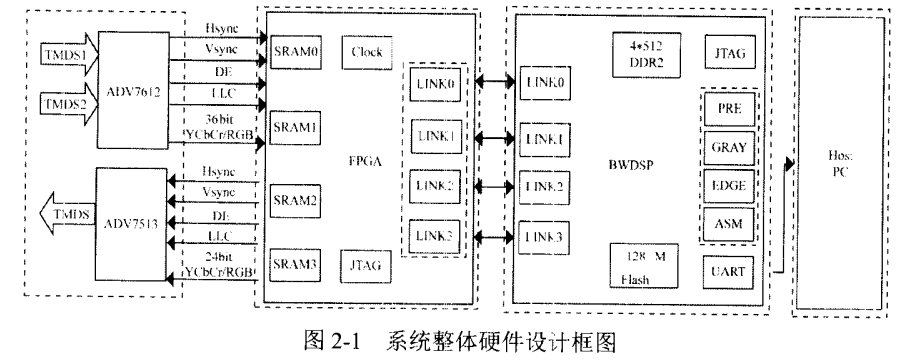 在某嵌入式系统中,视频处理单元负责对接收到的外部视频进行处理和控制。输入包括2路HDMI视频,在视频处理单元中通过叠加、选择、变换等方法输出1路 HDMI视频。系统整体硬件设计框图如图2-1所示,包括一个FPGA和一个DSP处理器,FPGA采用Xilinx公司的Virtex-5,DSP选用国产BWDSP100处理器,HDMI视频采集芯片采用ADI公司的ADV7612,HDML显示芯片选用ADI公司的ADV7513。系统处理器内核1.2V电源采用DC-DC稳压器LTM4616EV,其他电源(25V,18V,3.3V等)采用德州仪器公司的TPS754xx。外部内存选月镁光公司的MT47H32M16HR-25EIT,NandFlash选用S29GL128N10TA102。