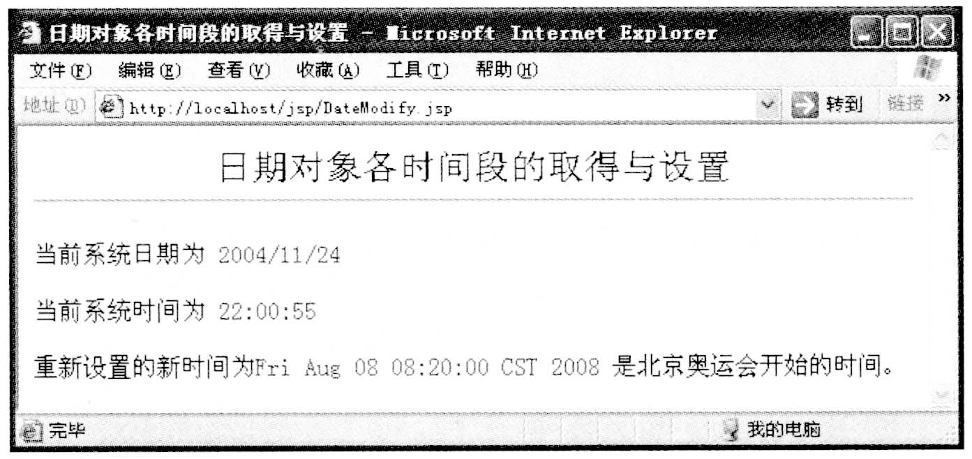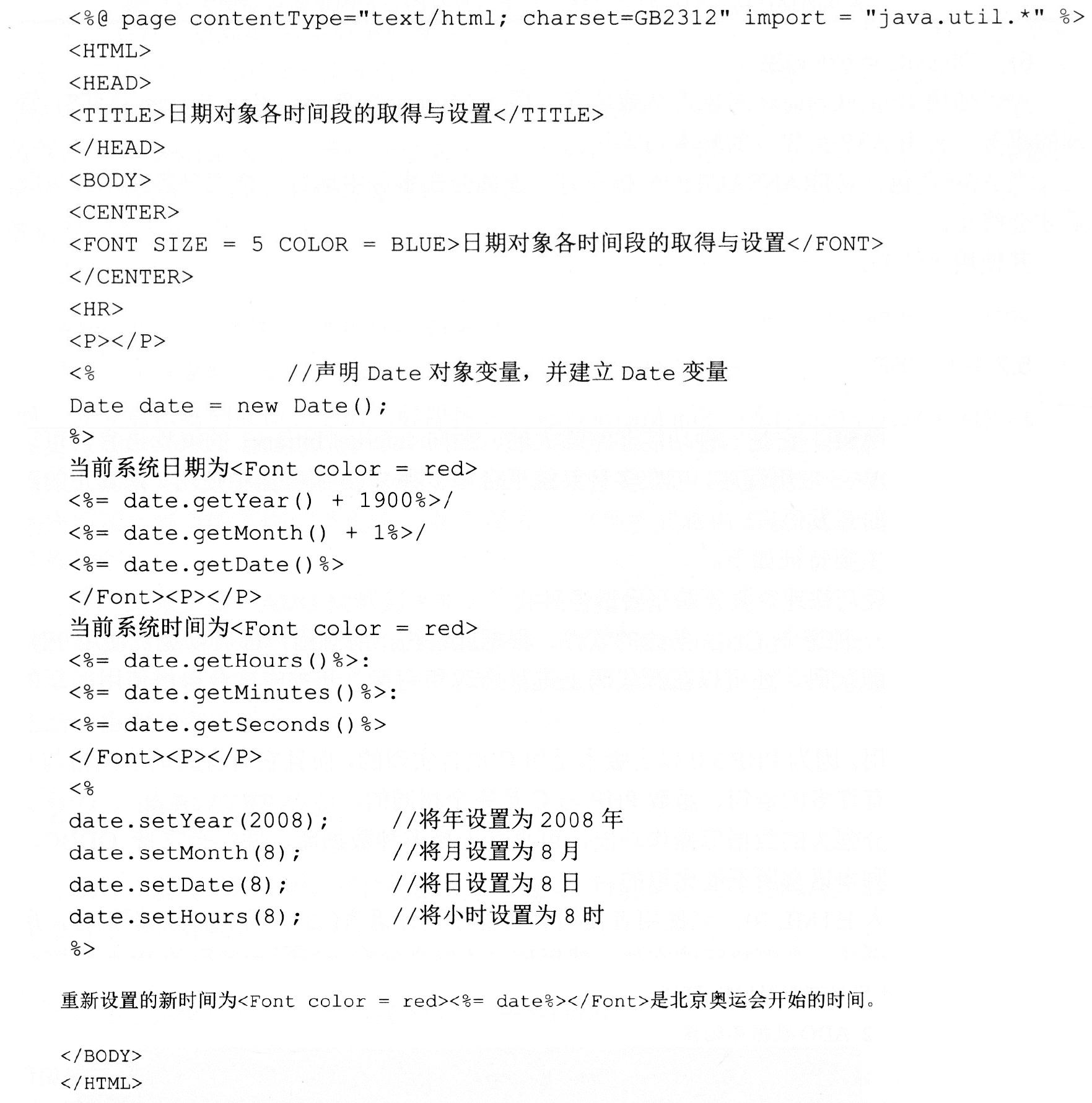下面是JSP的一个应用实例,主要完成日期对象的相关操作,首先获取系统当前时间,然后重新设置系统时间,将系统时间设置为2008年北京奥运会开始的时间。