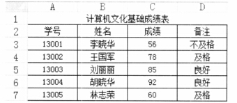 用Excel制作的学生计算机文化基础课程成绩表如下。当学生成绩小于60分,需要在对应的备注栏填“不及格”;若学生成绩大于59分,小于79,需要在对应的备注栏填“及格”,否则在对应的备注栏填“良好”。实现时,可在D3单元格输入“=IF((3),"不及格",(4)”,并向下拖动填充柄至D7单元格即可。