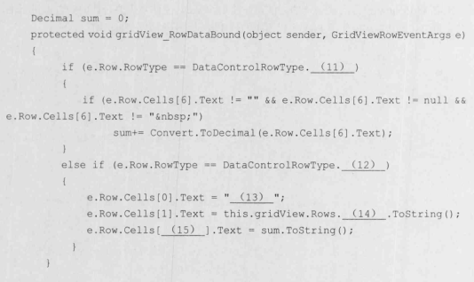 问题:2.3   假设某客户已经确认下单并需要结算,此时应该将该客户的订单信息展示,并统计客户购买商品的种类数、合计总金额,可使用GridView控件实现该功能。假定Grid View控件ID为“grid View”,绑定的订单数据中“金额”是Grid View控件的第6列(列从0开始),现要在GridView控件的Footer位置显示统计合计的信息,其中第0列显示文字“合计:”、第1列显示商品的种类数、在“金额”列显示金额合计数,根据以上描述,完成以下程序。