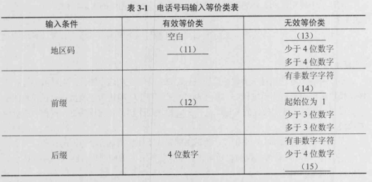 问题:3.3   软件系统中关于电话号码是这样设定的:电话号码由地区码、前缀和后缀3部分组成。地区码由空白或4位数字组成;前缀是非“0”或非“1”开头的3位数字;后缀是4位数字。测试小组设计了等价类,如表3-1所示。请根据题目说明及表3-1,填补空(11)〜(15)。