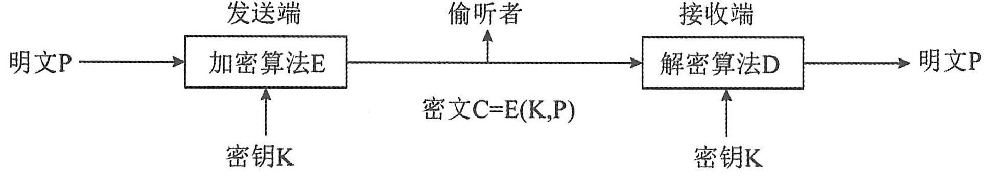 从图中可以看出,发送端把明文P用加密算法E和密钥K加密,变换成密文C,即C=E(K,P);接收端利用解密算法D和密钥K对C解密得到明文P,即P=D(K,C)。