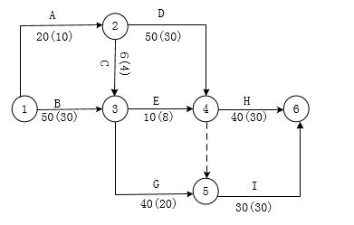 【说明】 刘某和李某分别是一个软件公司的项目经理和合同经理,该软件公司给某客户完成一个软件项目,根据分析该软件项目的网络计划如图4-1所示,箭线下方(或右方)括号外为正常持续时间,括号内为最短工作历时,假定计划工期为100天,根据实际情况和考虑被压缩工作选择的因素,缩短顺序依次为B、C、D、E、G、H、I、A ,试对该网络计划进行工期优化。