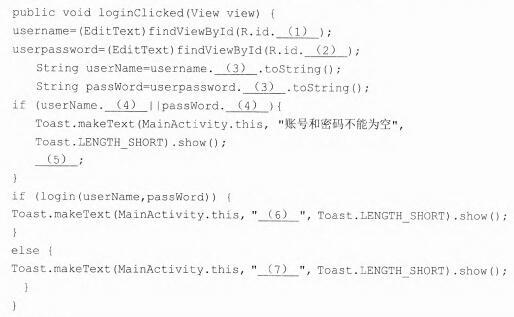 问题:2.1   在App登录界面的布局文件中,创建用户名输入框(id为“uname”)、密码输入框 (id为“password”)及登录按钮(id为“blogin”),在登录按钮的监听器中编写登录验证方法,要求登录成功时显示“登录成功”,登录失败时显示“登录失败”。其中可以调用login方法,根据输入的用户名及密码在数据库中进行查询,来判断用户身份是否合法。如用户合法,该方法返回值为true,否则返回值为false。根据描述,完成以下程序。
