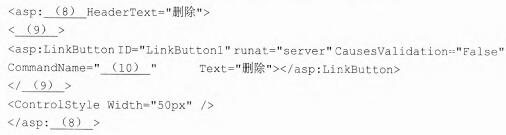 问题:2.2   采用ASP.NET(C#语言)实现管理员对商品的删除,具体操作是管理员在商品信息列表中点击需要删除的商品行中的“删除”按钮。创建商品信息列表一般可以采用GridView控件实现,在GridView控件每一行数据后加一个“删除”按钮列,该列采用 GridView控件模板列实现。根据题意,完成添加“删除”按钮的代码。