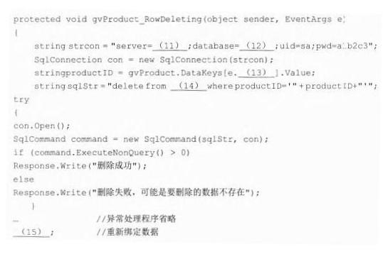 问题:2.3   GridView控件id为“gvProduct”,当点击该控件中CommandName为 “Delete” 的按钮时,将触发该控件的RowDeleting事件,在该事件注册的方法中实现商品数据的删除。假设数据库服务器地址为“145.23.1.211 ”,数据库名为“SW”,商品表名为“S_Product”,该表主键为“ProductID”,并将“ProductID”设为GridView控件的DataKeyNairames属性值。删除数据后,需要刷新GridView控件,可以调用BindData()方法重新绑定数据以实现刷新的效果。根据题意,完成删除指定商品的代码。