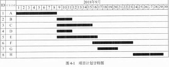 甘特图可用来安排项目中各项工作的进度,同时还能和各项资源在不同阶段的需求数量结合,有利于对项目管理过程进行有效的控制,当项目中某些工作进度安排有机动时间时,可以利用机动时间安排工作的实施进度,使项目对资源的集中需求尽可能分散,得到合理利用。例如,某项目的任务如下表所示,其甘特图如下图所示。