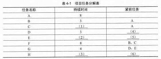 问题:4.1   根据项目甘特图,计算各工作的持续时间,并分析每项工作的紧前任务,填入表4-1中。