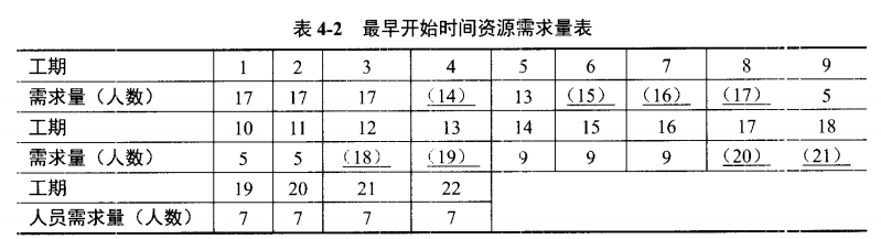 问题:4.3   请根据该项目网络图得出最早开始时间的甘特图,计算每天需要的劳动时数并填写完整表4-2中(14)~(21)处的空缺。