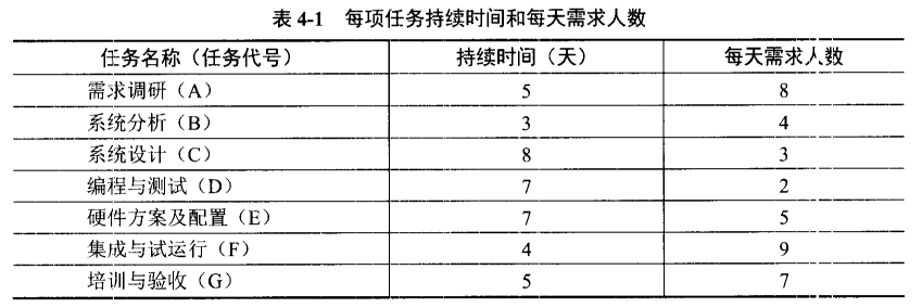 科信公司是一家大型电子商务企业,目前需要进行电子商务平台横向联网的整合和相关应用软件开发。项目计划从2020年1月1日开始,2020年1月22 日完成,持续22天。表4-1所列是项目中每项任务持续时间和每天人员需求数。
