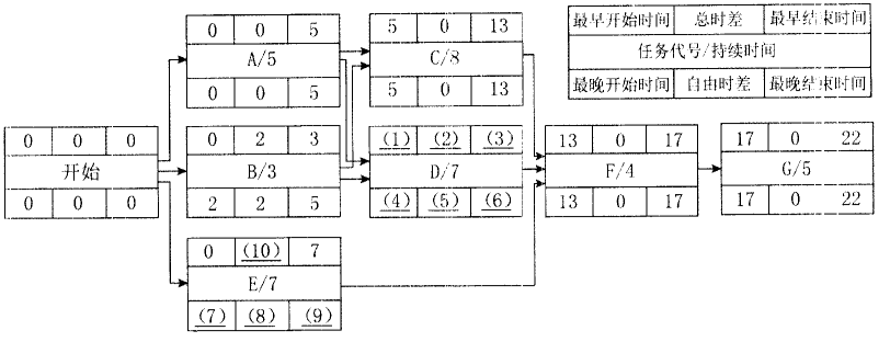 问题:4.1   请根据图4-1的项目任务逻辑关系,计算并填写其中的(1)~(10)处空缺。