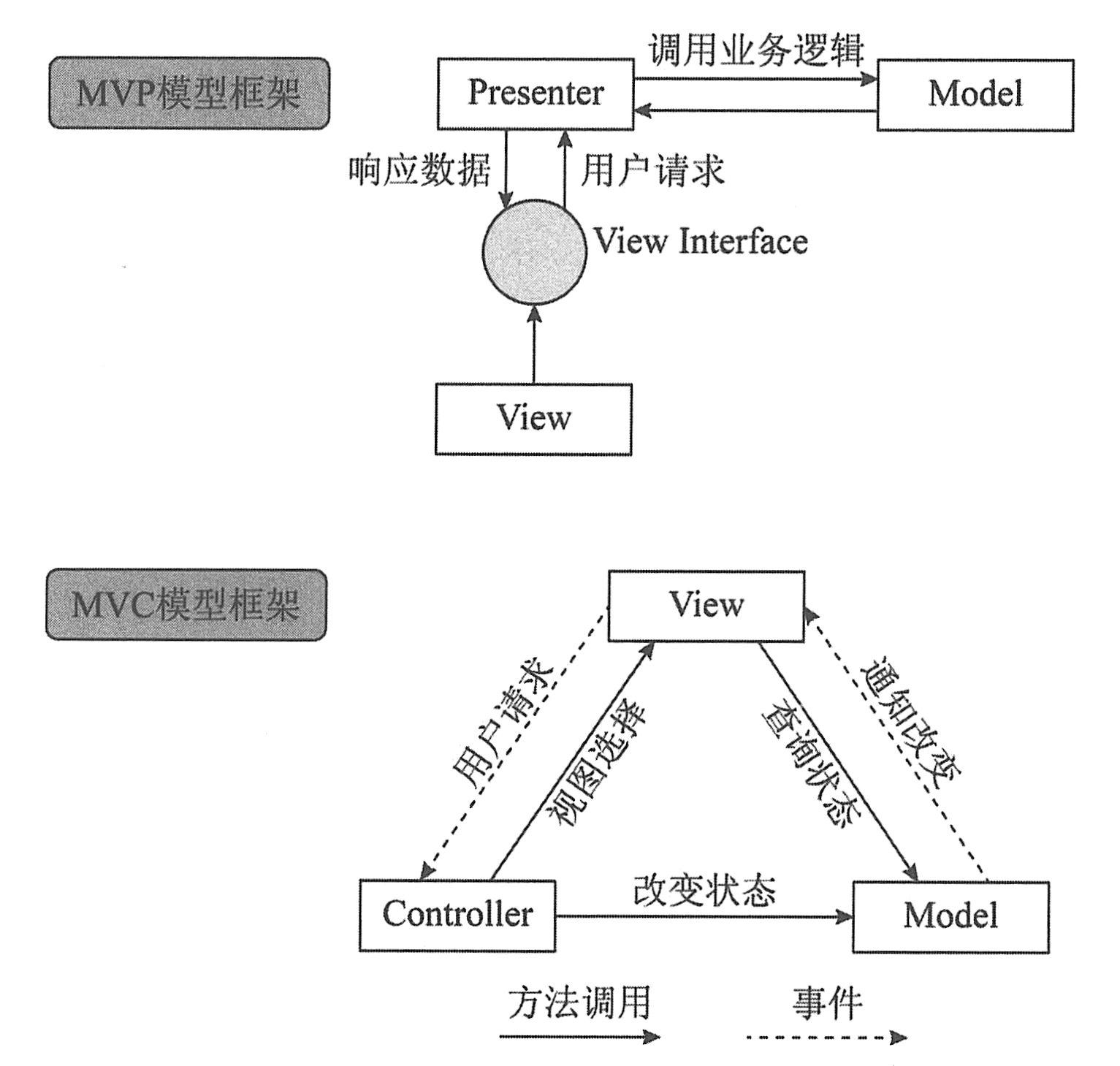 (1)MVP(Model-View-Presenter)。MVP模式是目前Android系统非常流行的框架,是从MVC模式演变过来的,它们的基本思想有相通的地方:Controller/Presenter负责逻辑的处理,Model提供数据,View负责显示。但是MVP与MVC有着一个重大的区别,如下图所示:在MVP中View并不直接使用Model,二者完全分离以减少耦合,它们之间的通信是通过Presenter(MVC中的Controller)来进行的,所有的交互都发生在Presenter内部,而在MVC中View会直接从Model中读取数据而不是通过Controller。MVP大大降低了耦合度(Activity不再进行复杂的操作),层级更明显,相对MVC来说MVP更加适用于Android应用的开发。