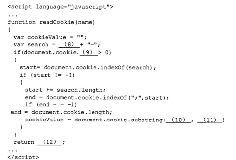 该网站购物车模块页面脚本语言是JavaScript,用户订购信息临时存在cookie中,下面是购物车页面中读取cookie值的函数,请完成该程序。