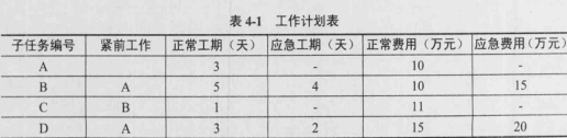 阅读以下说明,回答问题1至问题3。 陈诚是某品牌公司的项目经理,有着丰富的项目管理经验,最近负责某电子商务系统开发的项目管理工作。该项目经过工作分解后,子任务已经明确。为了更好地对该项目的开发过程进行监控,保证项目顺利完成,陈诚拟采用网络计划技术对项目进度进行管理。经过分析,陈诚得到了一张工作计划表,如表4-1所示。