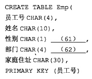 设有员工关系Emp (员工号,姓名,性别,部门,家庭住址),其中,属性“性别”的取值只能为M或F;属性“部门”是关系Dept的主键。要求可访问“家庭住址”的某个成分,如邮编、省、市、街道以及门牌号。关系Emp的主键和外键分别是(59)。“家庭住址”是一个(60)属性。创建Emp关系的SQL语句如下: