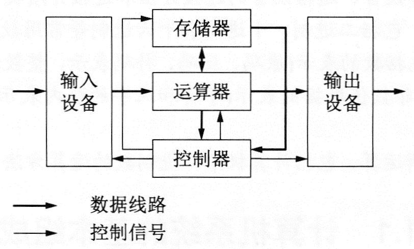 计算机硬件是由运算器、控制器、存储器、输入设备和输出设备五大部分及总线组成,如下图所示。