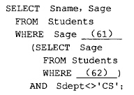 设学生关系为Students(Sno,Sname,Sex,Sdept,Sage,Sadd),其中Sno、Sname、Sex、Sdept、Sage、Sadd分别表示学生的学号、姓名、性别、所在系、年龄和住址。查询比计算机系(CS)所有学生年龄都小的其他系的学生姓名及年龄的SQL语句为: