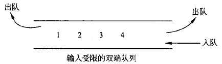 在实际应用中,可对双端队列的输出进行限制(即一个端点允许插入和删除,另一个端点只允许插入),也可对双端队列的输入进行限制(即一个端点允许插入和删除,另一个端点只允许删除)。可见,采用双端队列可增加应用中的灵活性。