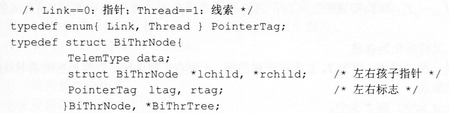 以二叉链表作为存储结构时,只能找到左、右子树信息,不能直接得到节点在任一序列中的前驱和后继信息,最简单的方法是每个节点上增加两个指针域,但有点浪费。其实,n个节点的二叉链表中必定存在n+1个空链域,因此可用这些链域来存放节点的前驱和后继信息。改进后的节点结构如下: