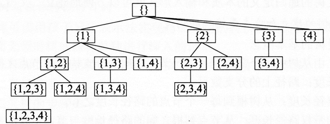如何利用树型结构这个参照系来设计求集合{1, 2, …,n}的幂集算法是我们讨论的重点。对于给定的集合{1,2,3,4},按幂集集合中的元素个数和字典次序建立的树如下图所示。