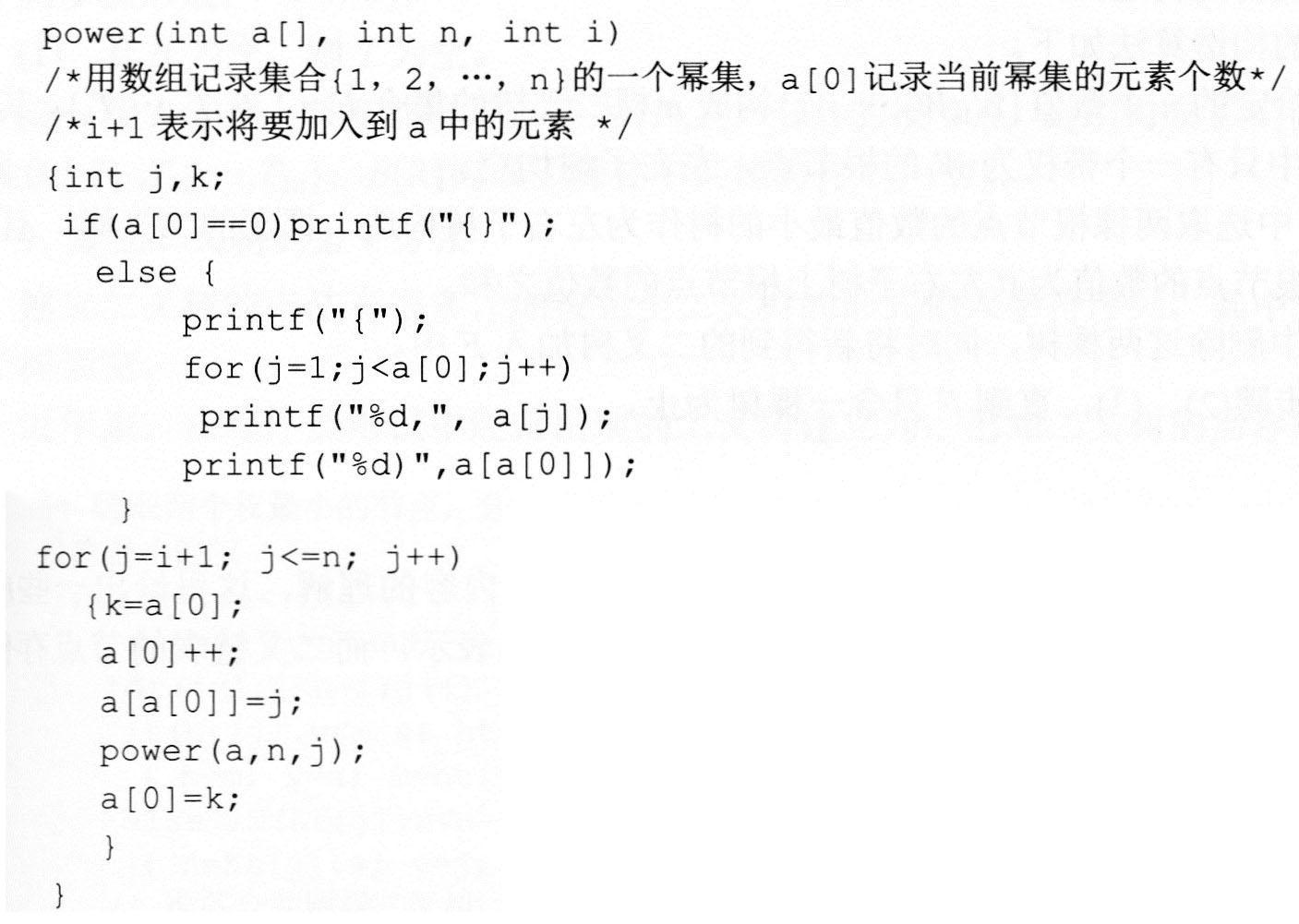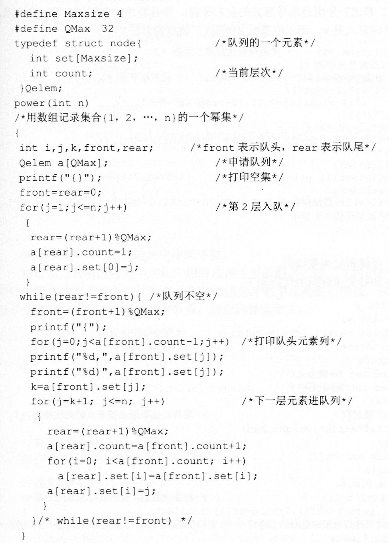 为保持集合中元素的字典次序,可采用两种方法来求集合{1, 2, 3, 4}的幂集集合,其一是采用前序遍历树;其二是按层次遍历树。特别要注意的是在设计求集合的幂集时并不建立真正的树,而是在考生的心中建立这样一个虚拟的树,并以这棵树为参照系。下面给出这两种方法的算法。