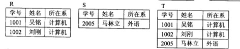 假设关系R、S、T如下表所示,关系代数表达式T= (59) : S= (60)。