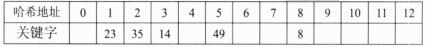 若关键码序列(23,35,14,49,8,12,30,7)采用散列法进行存储和查找。设散列函数为H(Key)=Key%11,采用线性探查法(顺序地探查可用存储单元)解决冲突,尚未构造完成的散列表如下所示,则元素12应存入哈希地址单元(42)。