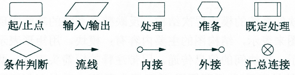 程序流程图是开发人员最熟悉也是用得最广泛的一种图形描述工具,其特点是简单、直观、易学。程序流程图的符号并不统一,下图所示是几种常用的符号。