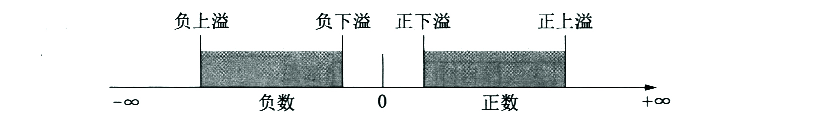 .浮点数的溢出:当运算的结果超出该机器浮点数可表示的范围时,则产生浮点数溢出,浮点数可表示的范围如下图所示。比如上例中,当浮点数的运算结果小于1/R(或大于R2p-1(1-2-m))时,则产生正下溢(或正上溢)。