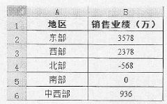 某公司有几个地区销售业绩如下表所示,若在B7单元格中输入(3),则该单元格的值为销售业绩为负数的地区数。若在B8单元格中输入(4),则该单元格的值为不包含南部的各地区的平均销售业绩