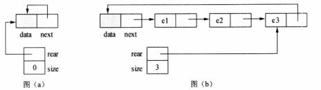 队列采用如下图所示的循环单链表表示,图(a)表示队列为空,图(b)为e1、e2、e3依次入队列后的状态,其中,rear指针指向队尾元素所在结点,size为队列长度。以下叙述中,正确的是(36)。