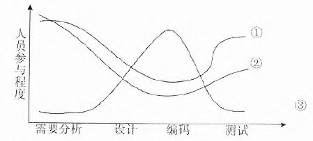 在软件开发的各个阶段,不同层次的人员参与程度并不一样。下图大致描述了某软件开发公司高级技术人员、管理人员和初级技术人员在各个阶段参与的程度,其中,曲线①、②、③分别对应(54)。
