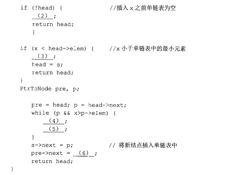 函数insertList(LinkList headElemTypex)的功能是为元素x创建结点并将其插入到头指针为head且不含头结点的单链表中,并保持表中元素非递减有序排列的特点,最后返回头指针