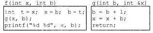 下面所定义的函数f的两个参数传递方式均为值调用,函数g的第一个参数为值调用、第二个参数为引用调用。对于函数调用(2,3),执行后输出为( )。