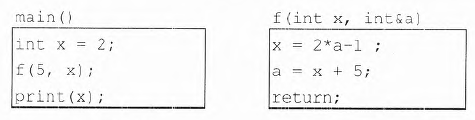 函数main()、f()的定义如下所示。调用函数f()时,第一个参数采用传值(call by value) 方式,第二个参数采用传引用(call by reference)方式,main()执行后输出的值为(35)。