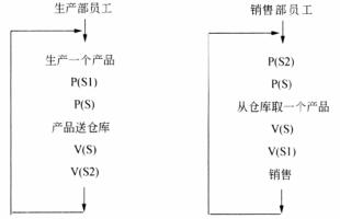 假设某企业有一个仓库。该企业的生产部员工不断地将生产的产品送入仓库,销售部员工不断地从仓库中取产品。假设该仓库能容纳n件产品。采用PV操作实现生产和销售的同步模型如下图所示,该模型设置了3个信号量S、S1和S2,其中信号量S的初值为1,信号量S1的初值为(25),信号量S2的初值为(26)。