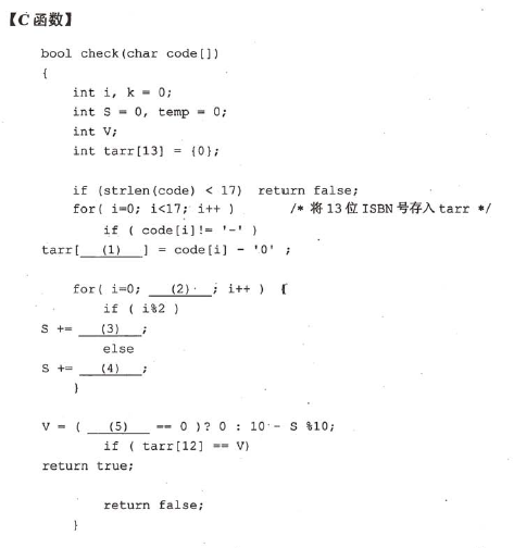 函数check(char code[])用来检查保存在code中的一个ISBN号的校验码是否正确,若正确则返回true,否则返回false。例如,ISBN号“978-7-5606-2348-1”在code中的存储布局如表3-1所示(书号的各组成部分之间用分隔):