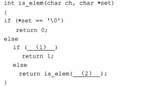 递归函数is_elem(char ch,char*set)的功能是判断ch中的字符是否在set表示的字符集合中,若是,则返回1,否则返回0。
